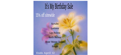 15% off total order. Now thru April 12th. Apply coupon code birthday at checkout to receive discount.